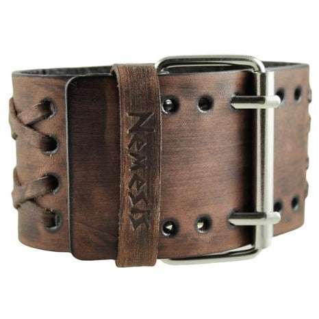 Embossed 3D Blue Watch with Double X Distressed Brown Leather Wide Cuff