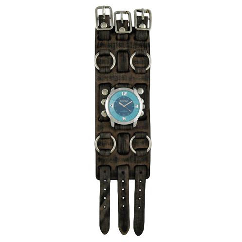 Embossed 3D Turquoise/Deep Blue Watch with Bullet Ring Distressed Dark Brown Leather Triple Strap Cuff