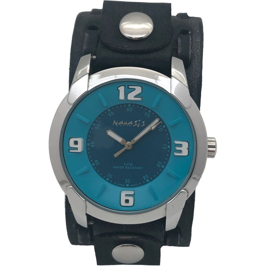 Embossed 3D Turquoise/Deep Blue Watch with Perforated Dash Distressed Dark Brown Leather Cuff