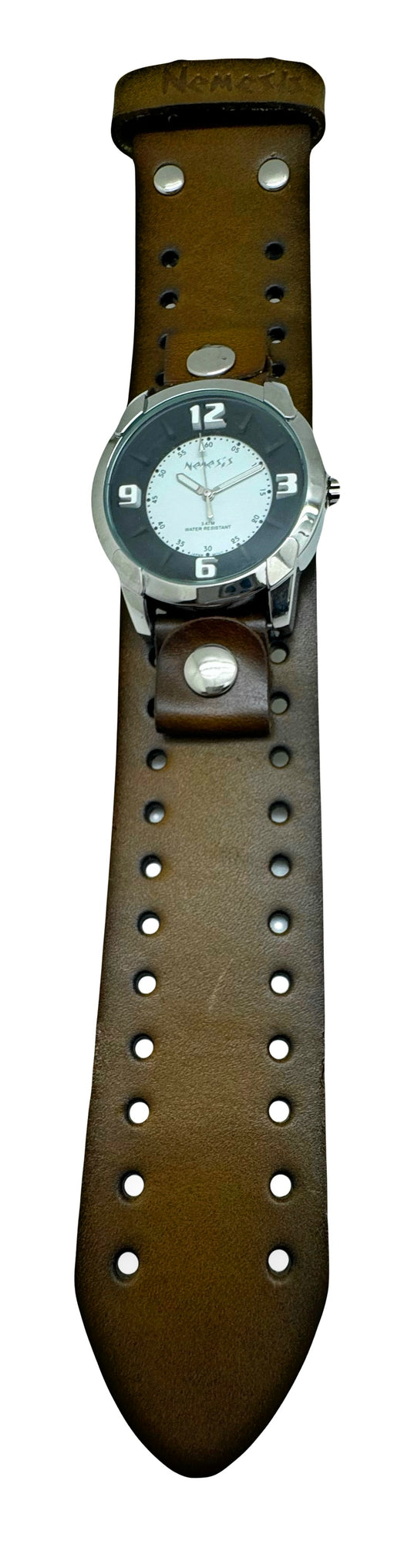 Embossed 3D White Watch with Distressed Dark Brown Leather Cuff