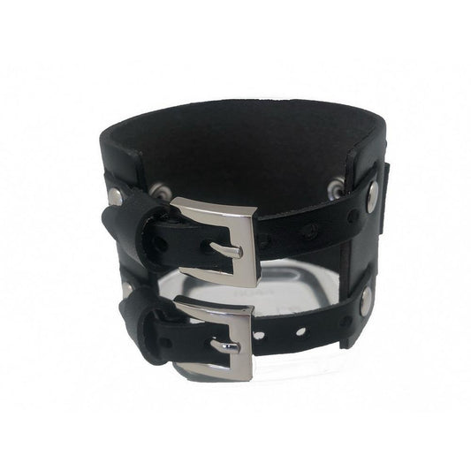 Perforated Black Leather Double Strap Ladies Cuff