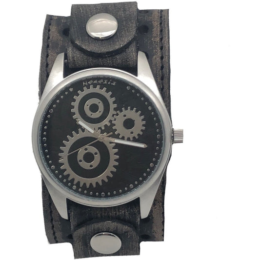 Geared Black Watch with Stitched Perforated Distressed Black Leather Cuff VBS112K