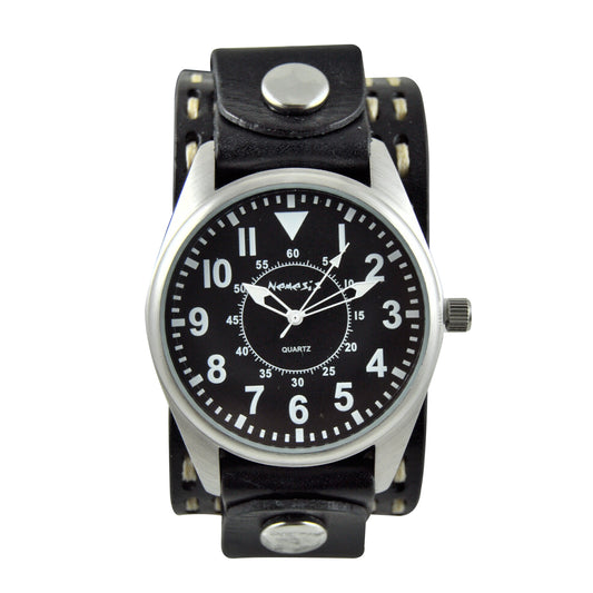 Classic Black Watch with Double White/Grey Stitched Brown Leather Cuff