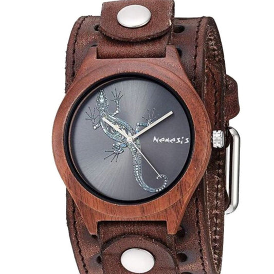 Gecko Natural Wood Watch with Stitched Perforated Distressed Brown Leather Cuff