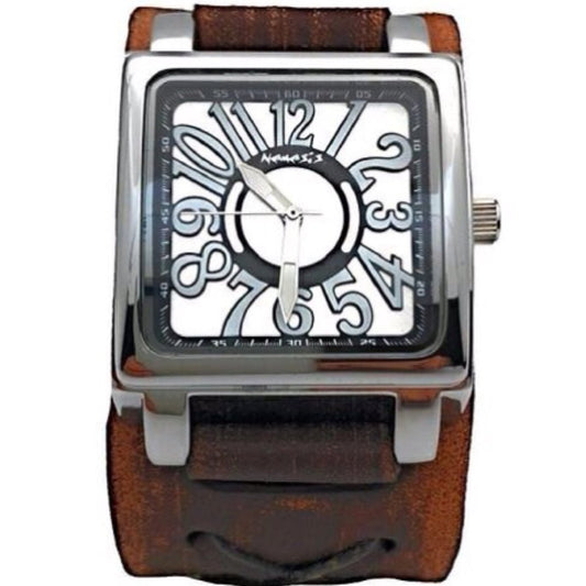 Nemesis Unix square case 3 D dial watch with Brown Vintage x cuff leather band BFXB256S