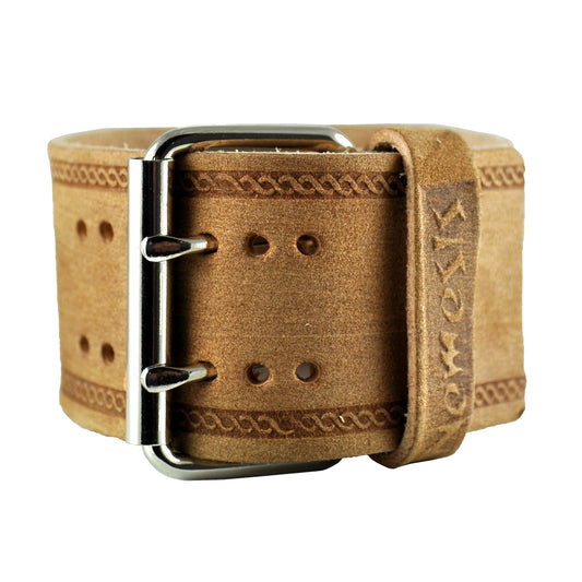 Double Stitched Embossed Distressed Brown Leather Wide Cuff BUIN
