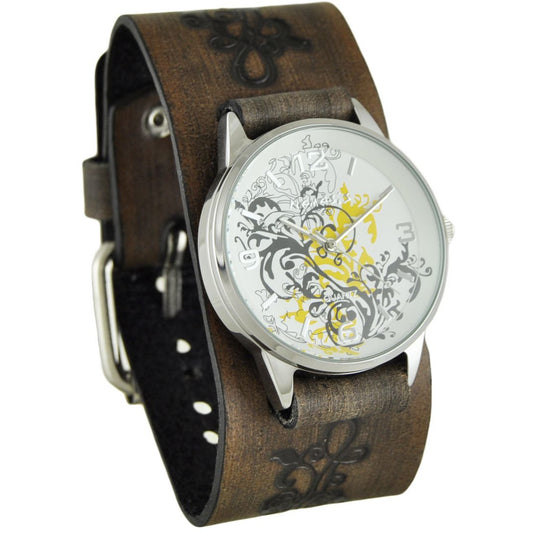 Yellow Plant Art Watch with Faded Dark Brown Embossed Flower Design Leather Cuff Band BVFB827Y