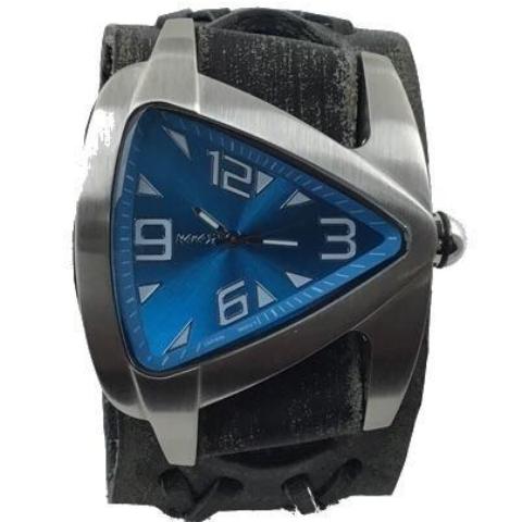 Teardrop Blue Watch with Distressed Black Leather Wide Cuff